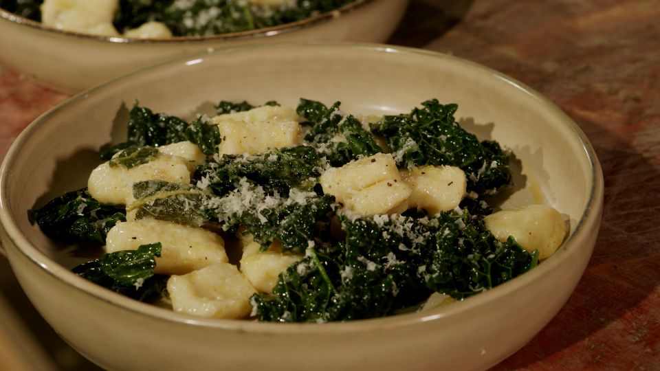 Kook de gnocchi totdat ze boven komen drijven en haal met een schuimspaan uit de pan en doe direct bij de salieboter en cavolo nero. Beweeg voor ongeveer een halve minuut de gnocchi en botersaus lekker door elkaar. Schep op een bord garneer met geraspte kaas en olijfolie en serveer direct.
