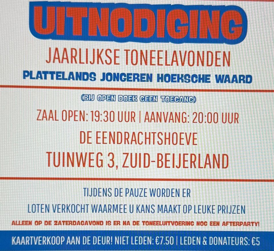 Vrijdag- en zaterdagavond 30 en 31 januari organiseert de Plattelands Jongeren Hoeksche Waard het jaarlijkse toneelstuk in de Eendrachtshoeve te Zuid-Beijerland. Het toneelstuk ''Of je worst lust…!!!” is een komedie in vijf bedrijven.