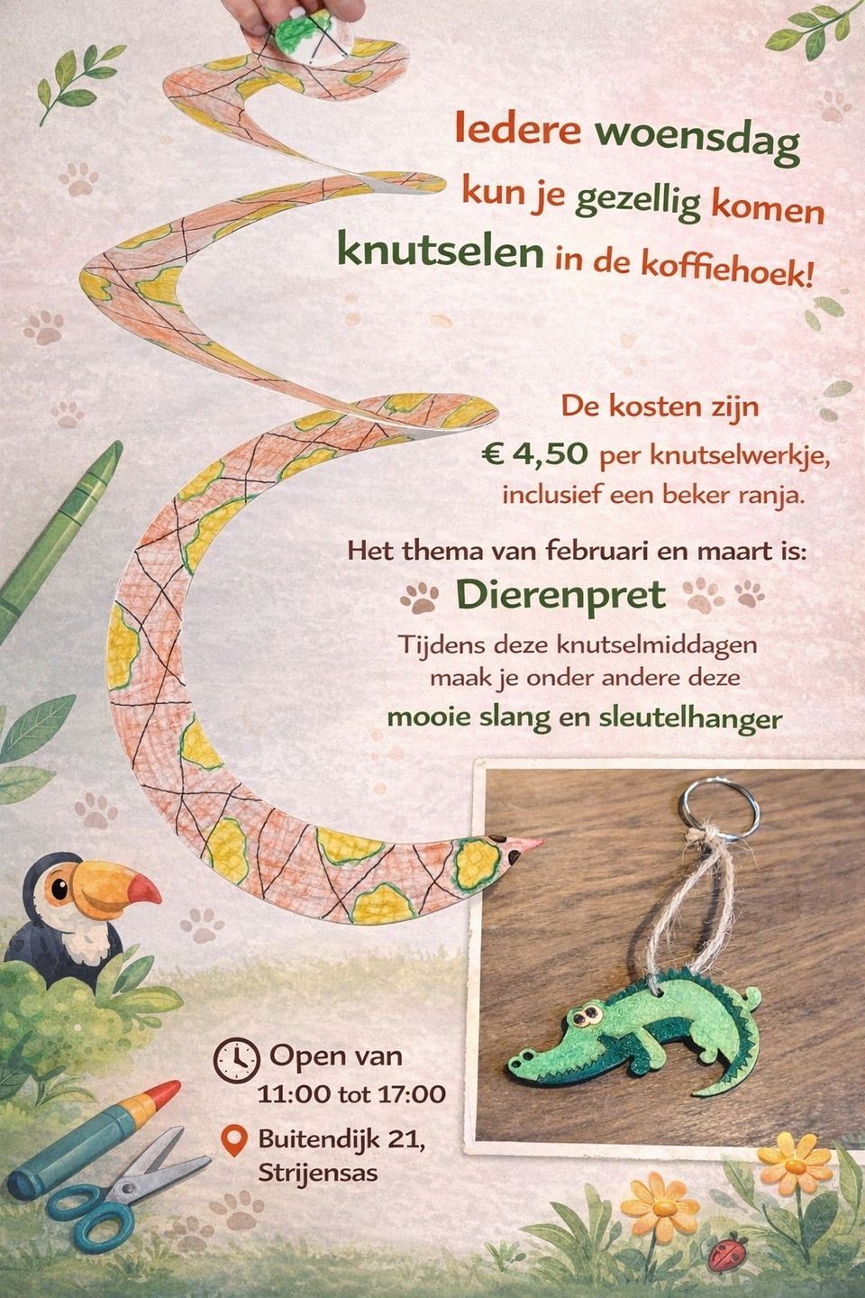 Het thema van februari en maart is: Dierenpret. Tijdens deze knutselmiddag maak je onder andere deze mooie slang en sleutelhanger met diertje naar keuze!