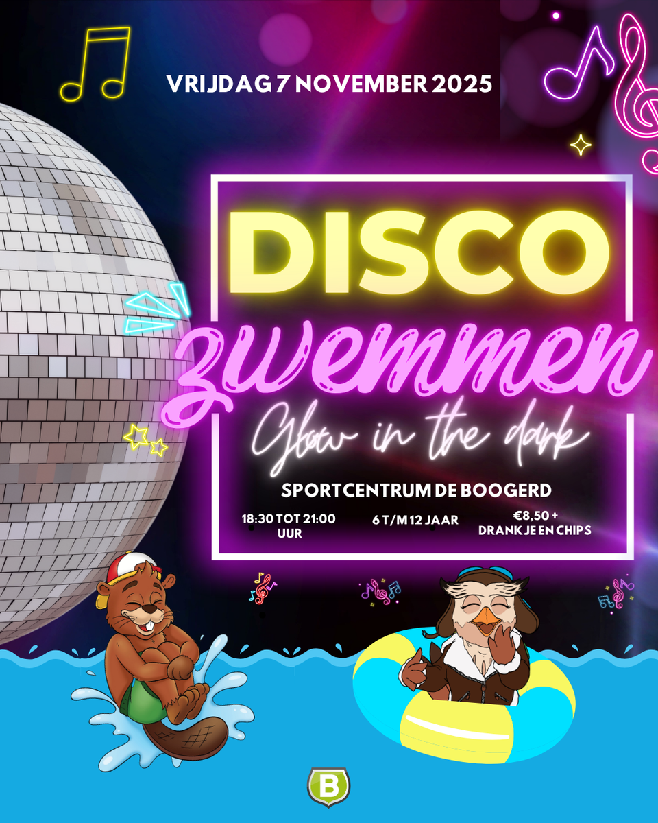Trommel je vrienden op en kom naar het leukste discofeestje van deze maand! Op vrijdag 7 november verandert Sportcentrum de Boogerd in een spectaculair zwemparadijs vol licht, neonkleuren en knallende beats. Trek je felste zwemkleding aan en straal in het donker!
