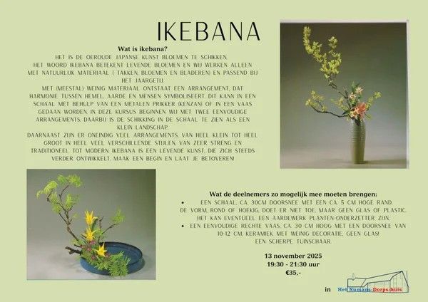 De zeer ervaren Els Schnabel gaat ons de beginselen van de Japanse kunst Ikebana bijbrengen. Je gaat naar huis met een stuk van levende materialen dat harmonie tussen hemel, aarde en mensen symboliseert.