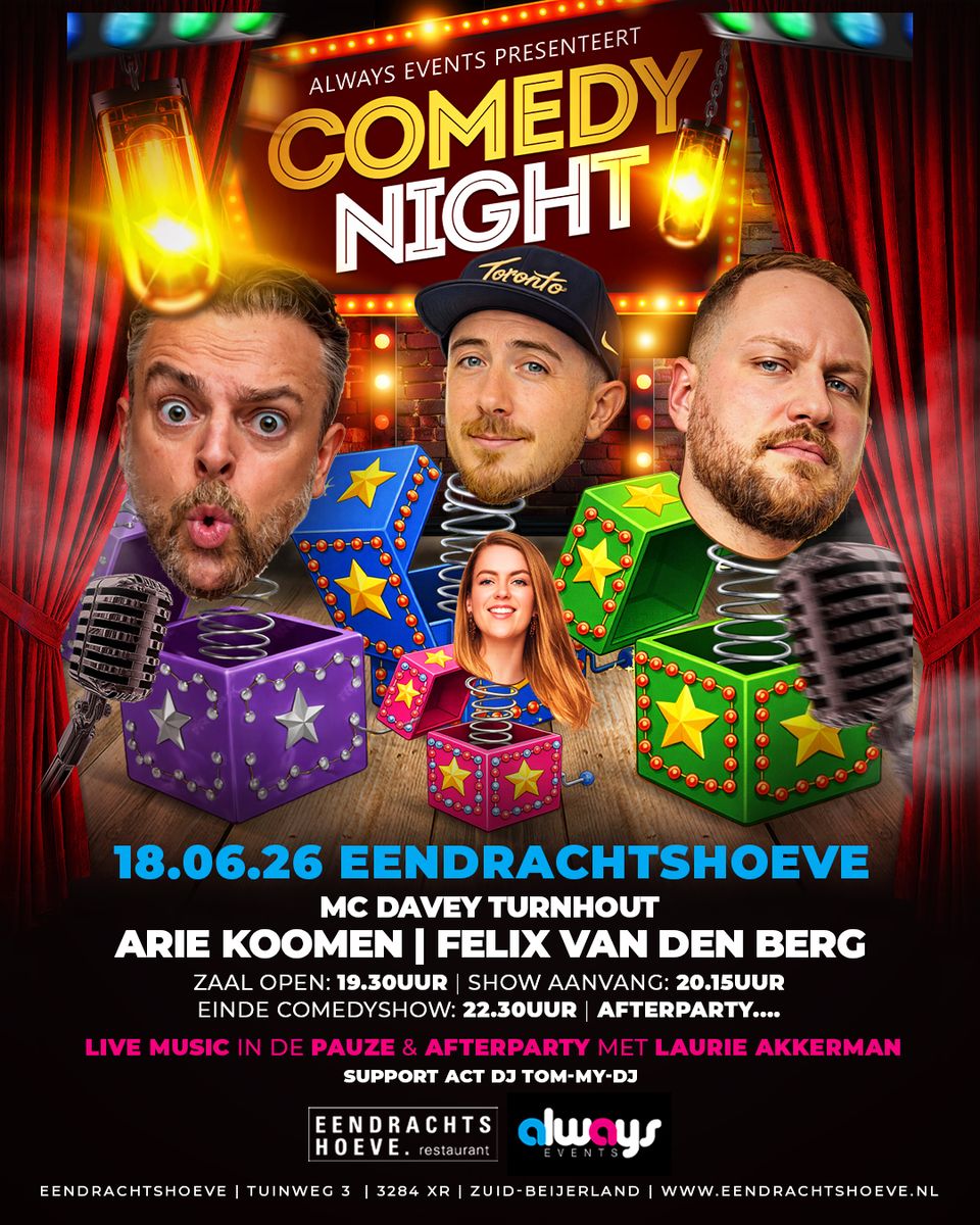 Always Events presenteert Comedy Night met Arie Koomen, Felix van den Berg & MC Davey Turnhout.
