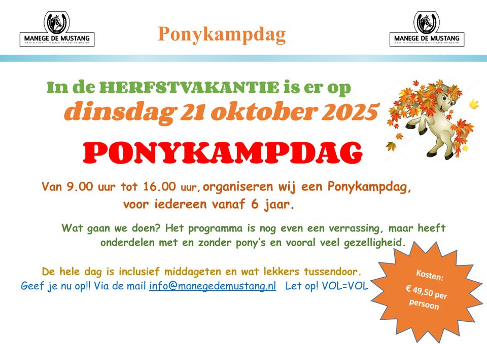 Dinsdag 21 oktober hebben we weer een ponykampdag voor iedereen vanaf 6 jaar. Een leuke dag vol activiteiten met en zonder pony's. Ook als je geen ervaring hebt met paardrijden, kan je meedoen.