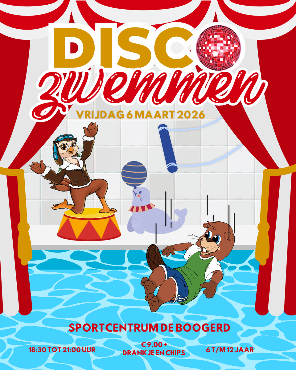 Op vrijdag 6 maart staat Sportcentrum De Boogerd in het teken van een spectaculaire Circus Edition van het populaire discozwemmen. Het zwembad wordt voor één avond omgetoverd tot een feestelijke circusarena, compleet met muziek, lichteffecten en een gezellige sfeer.