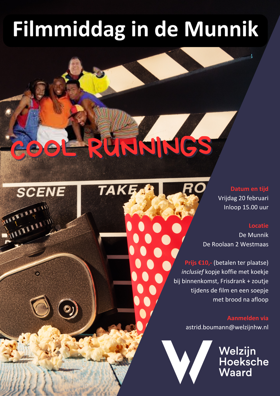 Welzijn Hoeksche Waard organiseert weer een gezellige filmmiddag voor volwassenen in ontmoetingscentrum De Munnik in Westmaas. Op vrijdag 20 februari wordt de Disneyfilm Cool Runnings vertoond. Cool Runnings is een inspirerende en humoristische film, gebaseerd op het waargebeurde verhaalvan het Jamaicaanse bobsleeteam dat tegen alle verwachtingen in deelneemt aan de Olympische Winterspelen. Een feelgoodfilm over samenwerking, doorzettingsvermogen en geloven in jezelf. De inloop begint om 15.00 uur, waarbij bezoekers welkom worden geheten met een drankje. Om 15.30 uur start de film. Tijdens de film wordt gezorgd voor een drankje en een zoutje. Na afloop is er ruimte om samen na te praten onder het genot van een kom verse soep met brood.